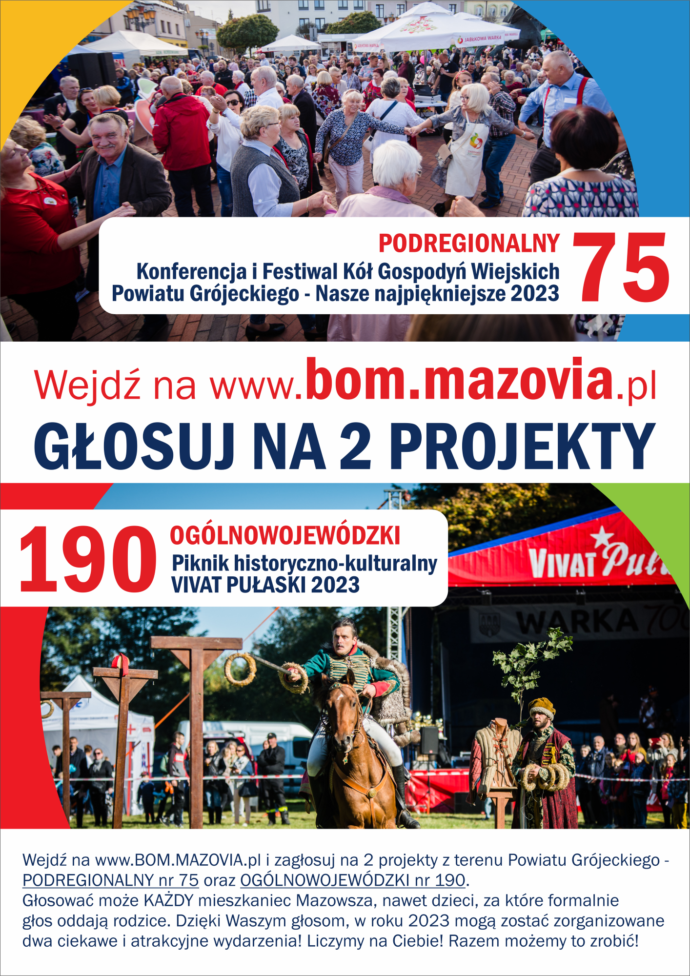 Powiat Grójecki w roku 2022 r. złożył do Budżetu Obywatelskiego Mazowsza dwa projekty (Konferencja i Festiwal Kół Gospodyń Wiejskich Powiatu Grójeckiego – Nasze najpiękniejsze oraz Piknik Historyczny VIVAT PUŁASKI), które przeszły pozytywną weryfikację i zostały skierowane do głosowania mieszkańców. W związku z powyższym, zwracamy się z prośbą o wsparcie tej inicjatywy poprzez rozpropagowanie informacji o głosowaniu wśród uczniów. Głosowanie rusza 8 czerwca 2022 r. i potrwa do 30 czerwca 2022 r. Zasady głosowania są przedstawione w piśmie, które stanowi załącznik do niniejszej wiadomości.
